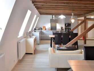 COLMAR, QUARTIER DES MARAICHERS, au 1er et dernier étage, beau duplex de 95,00m² au sol et 90,94m² carrez comprenant une entrée, une cuisine équipée, un séjour avec accès à la terrasse de 12m², une mezzanine (salon tv), deux chambres (une au premier niveau et l'autre à l'étage, avec possibilité de la diviser pour en faire une troisième), une salle de bains (baignoire et douche), une cave et un parking privatif.