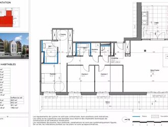 - une entrée, un séjour/ cuisine spacieux de 58,3m2 avec accès au balcon de 39m2, deux salles de bain, trois chambres, une buanderie, une loggia.
